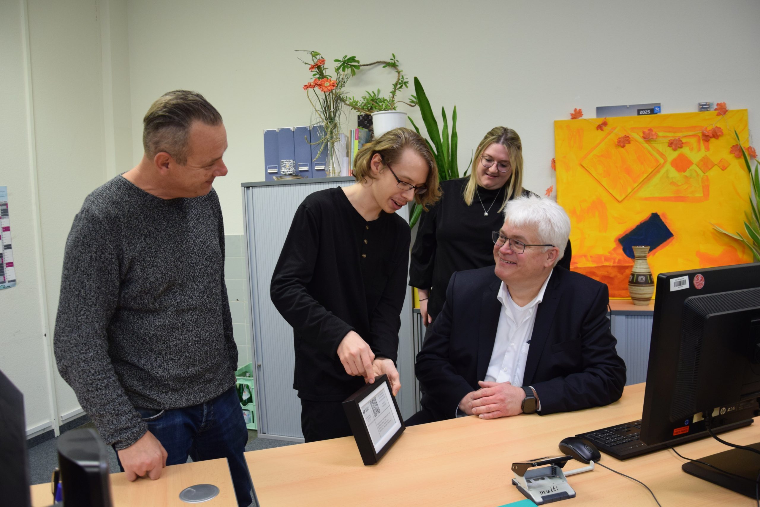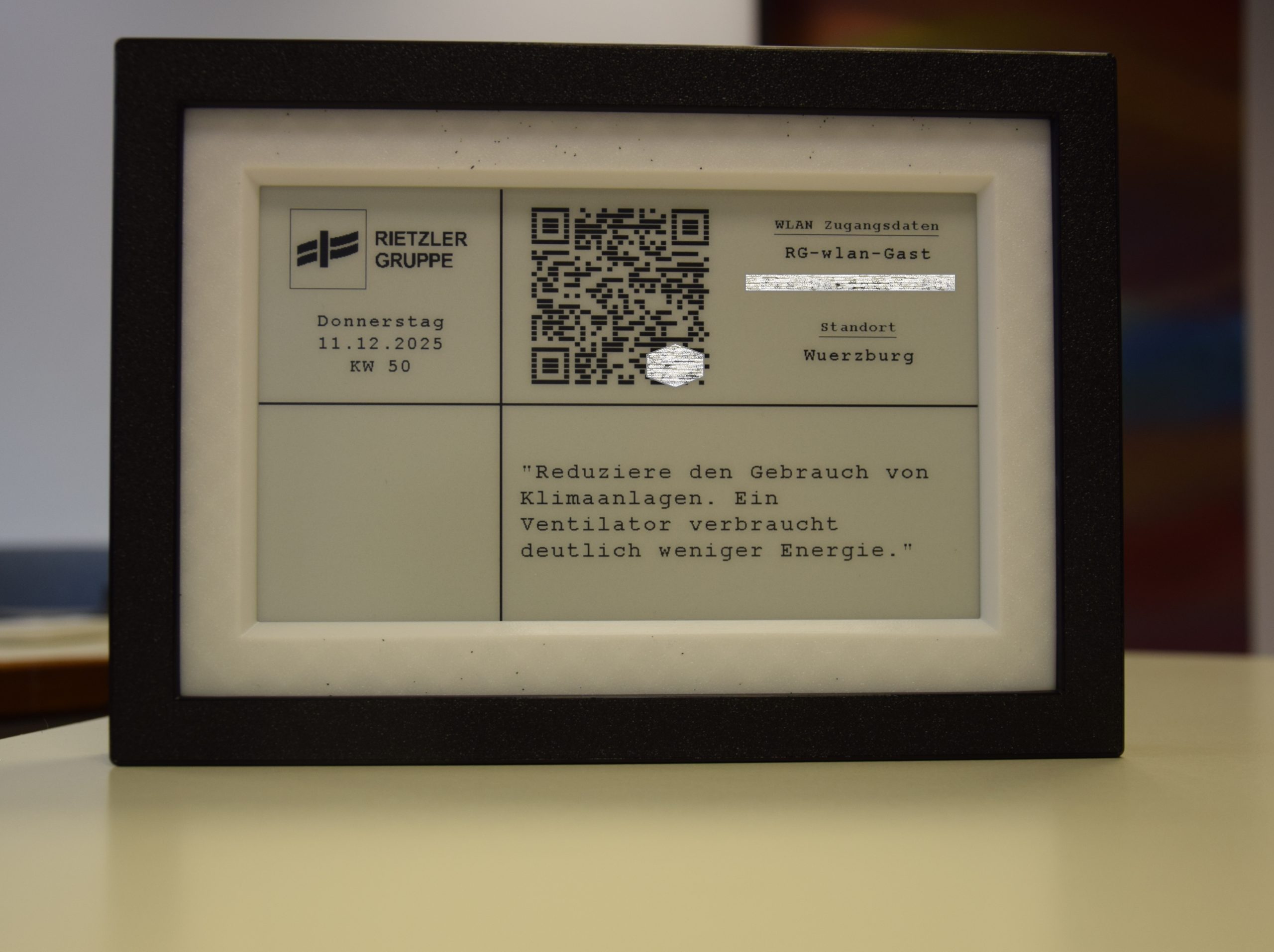 Ein aktuelles Projekt zeigt beispielhaft, wie Digitalisierung und Nachhaltigkeit bei uns zusammenwirken: Chris entwickelte einen E-Paper-Reader, der in Besprechungsräumen den aktuellen Gäste-WLAN-Code digital anzeigt. Die Lösung ersetzt Papierlisten, reduziert Ressourcenverbrauch und optimiert unsere interne Abläufe – ein kleiner Baustein mit großer Wirkung für nachhaltige Unternehmensprozesse.